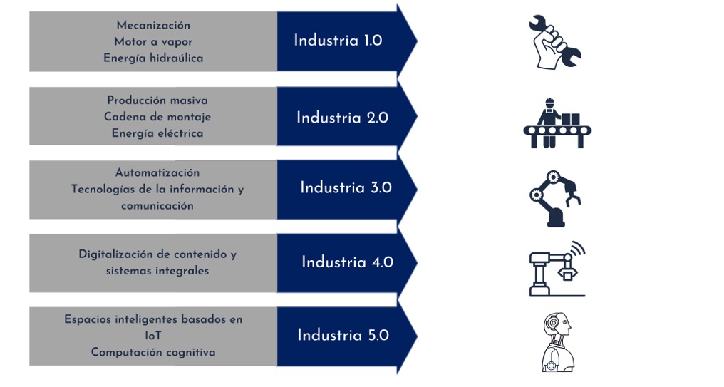 Desde la primera Revolución Industrial con la máquina de vapor, pasando por la producción en masa, la automatización y la digitalización facilitadas por la Internet, hasta la actual Industria 5.0, las tecnologías han transformado profundamente la producción, la comunicación y la enseñanza. La Industria 5.0, centrada en la colaboración entre los seres humanos y las máquinas, se destaca por integrar la inteligencia artificial (IA) en procesos productivos y educativos, de manera más inteligente y sostenible (figura 1).