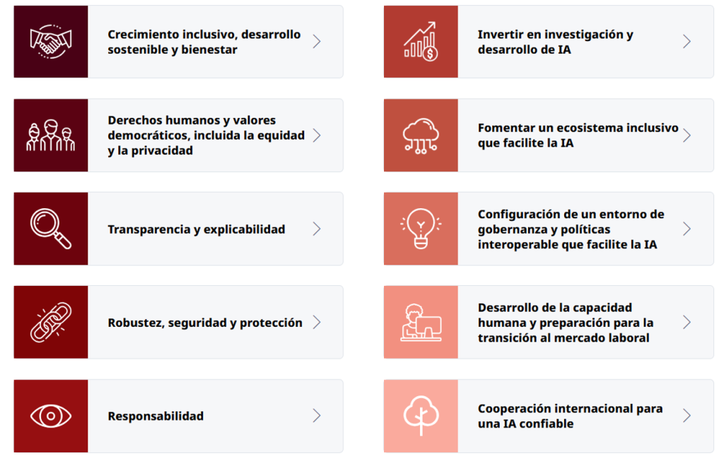 Los OECD AI Principles (2019, 2024) constituyen una referencia clave para un desarrollo de la IA confiable, ético y centrado en las personas. Se organizan en dos ejes: por un lado, principios de valor que promueven la inclusión, la sostenibilidad, el respeto a los derechos humanos, la transparencia, la seguridad y la rendición de cuentas; por otro, recomendaciones de política que impulsan inversión en I+D, ecosistemas inclusivos, marcos de gobernanza interoperables, capacitación para el empleo y cooperación internacional. La Figura 3 ilustra estos principios de manera resumida, mostrando tanto los valores fundamentales como las recomendaciones para los responsables de las políticas mencionadas.