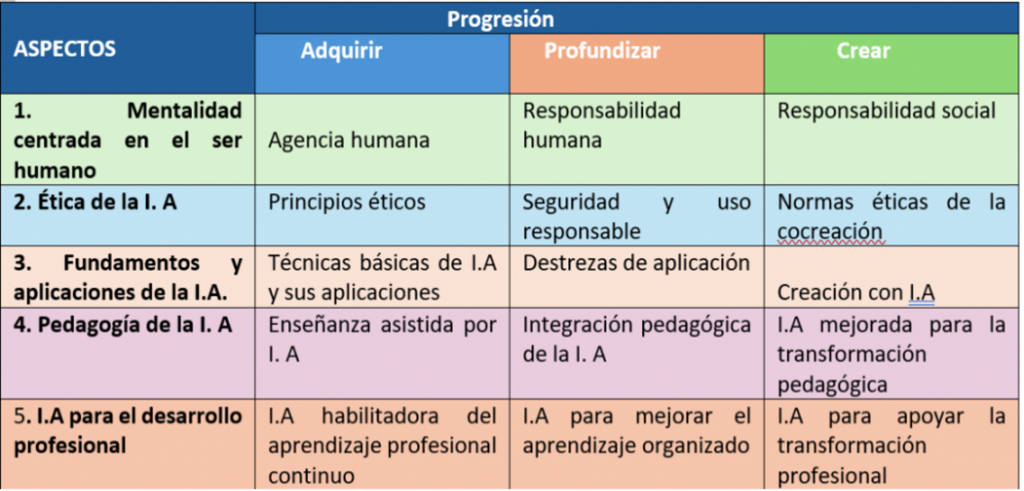 La UNESCO complementa este marco con instrumentos específicos para la educación. El AI Competency Framework for Teachers guía la formación docente, por medio de cinco áreas y tres niveles de progresión, promoviendo un uso ético, eficaz y pedagógicamente relevante de la IA en el aula. La Figura 4 presenta estas áreas y niveles de manera visual.