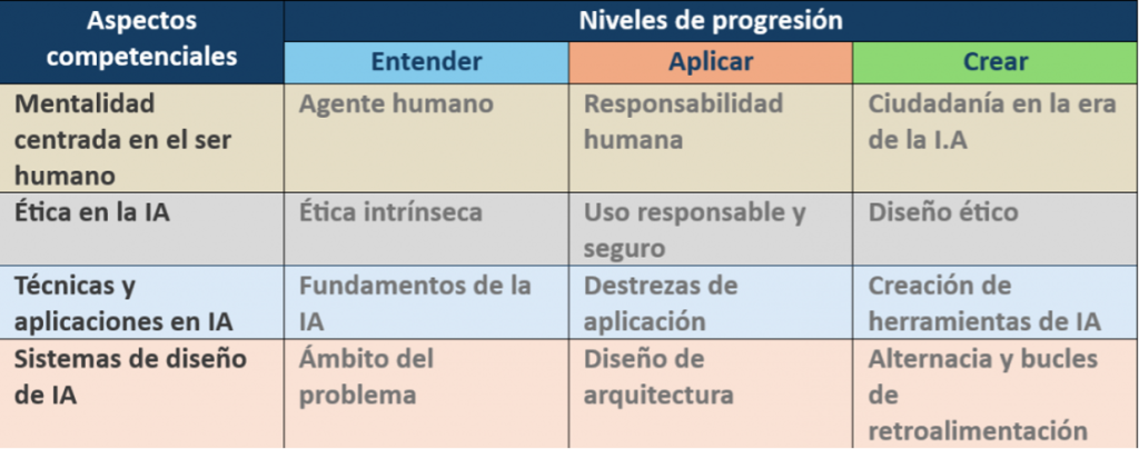 A su vez, el AI Competency Framework for Students (Figura 4) se centra en el pensamiento humano, la ética, los fundamentos técnicos y la creatividad en el diseño de sistemas de la IA, orientando a los estudiantes hacia un uso responsable y crítico de esta tecnología.
